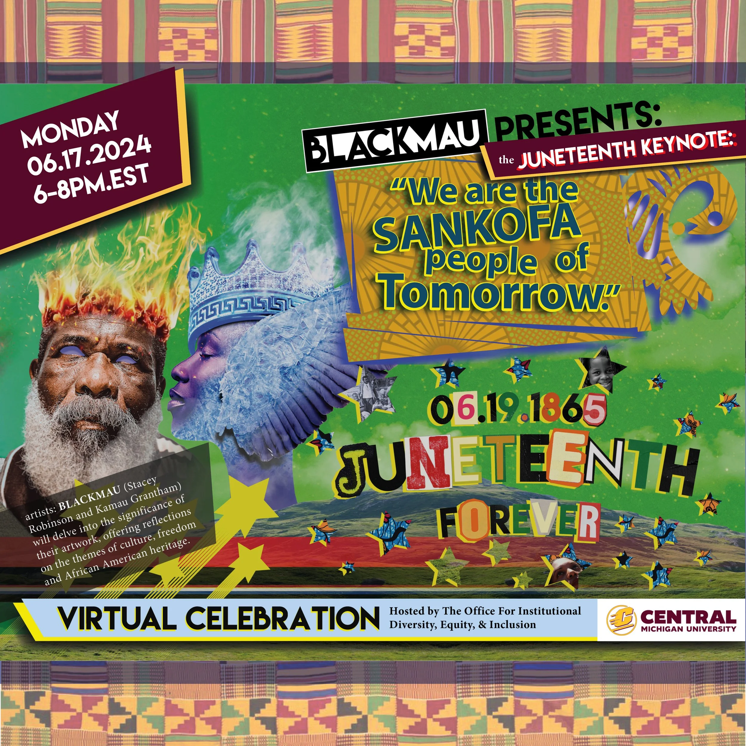Central Michigan University hosts BLACKMAU aka (Stacey Robinson and Kamau Grantham. Robinson and Grantham) for a Juneteenth conversation where the duo will delve into the significance of their artwork, offering reflections on the themes of culture, freedom and African American heritage. This takes place virtually on Monday, June 17, 6-8pm.